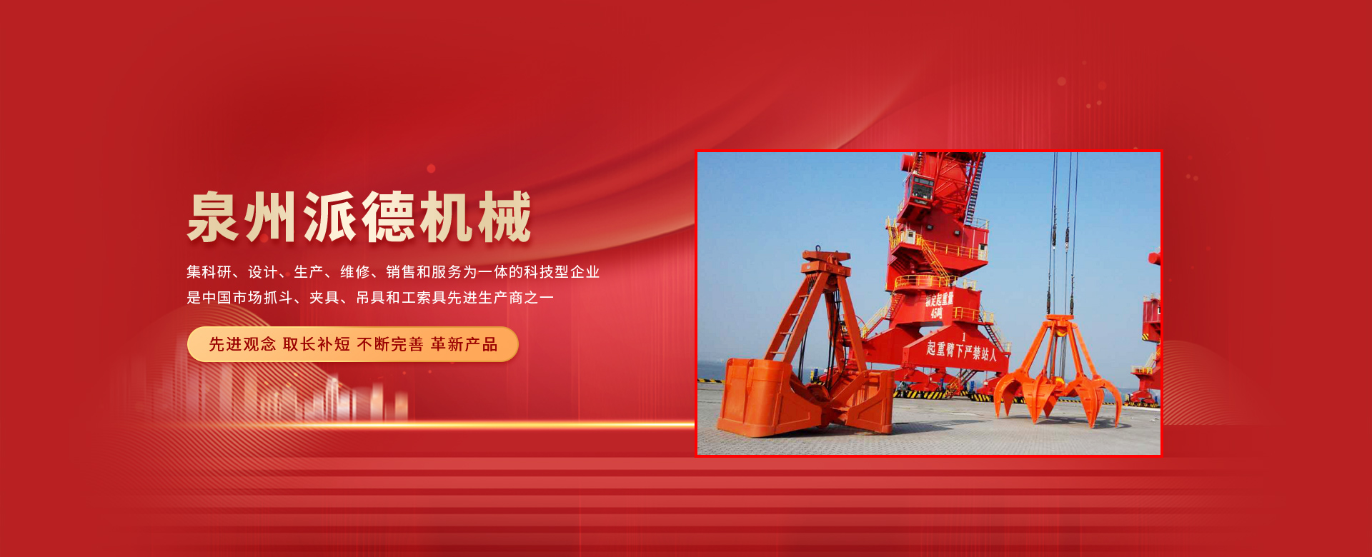 泉州派德機(jī)械有限公司成立于2012年5月,位于全國(guó)文明的古城福建泉州,公司擁有各類型專業(yè)員工82人,其中高級(jí)工程師1人,工程師4人,助理工程師5人,是一家集科研、設(shè)計(jì)、生產(chǎn)、維修、銷售和服務(wù)為一體的科技型企業(yè),是中國(guó)市場(chǎng)抓斗、夾具、吊具和工索具先進(jìn)生產(chǎn)商之一。產(chǎn)品采用國(guó)內(nèi)外先進(jìn)的設(shè)計(jì)方案、技術(shù)規(guī)范、制造過(guò)程、工藝流程和服務(wù),憑借在抓斗、夾具、吊具和工索具領(lǐng)域的超前設(shè)計(jì)理念和成熟的技術(shù)、工藝和管理,在抓具領(lǐng)域迅速崛起。